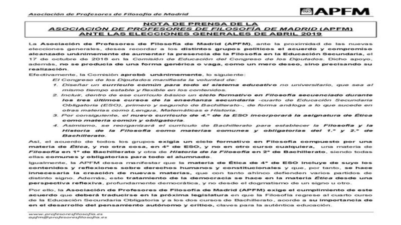 La Asociación de Profesores de Filosofía de Madrid (APFM) recuerda y exige a los distintos partidos que tras las elecciones generales cumplan el acuerdo alcanzado unánimemente en la Comisión de Educación de volver a poner Ética en 4ºESO, Filosofía en 1º Bachillerato e Historia de la Filosofía en 2º.