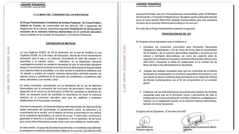 Unidas Podemos demanda en esta PNL que se configuren los contenidos educativos para impartir el conocimiento de la "lucha antifranquista" por los "valores y libertades democráticas", así como los 40 años de "represión de la dictadura".