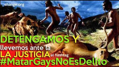 en España apoyar cualquier acto de violencia por razón de sexo, raza, religión u orientación sexual está penado. difundir y a poyar el odio en las redes sociales a este tipo de crímenes, considero que debería estar penado también. Corre un hagstag por las redes sociales #MatarGaysNoesDelito que vulnera claramente la ley incitando al odio.