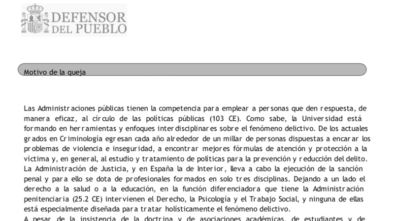 Como consecuencia, en mi nombre, se ha lanzado una campaña de concienciación en la plataforma “change.org” que cuenta hasta el momento con cerca de dos millares de adhesiones. Aunque los profesionales en Criminología deberían estar en las Relación de Puestos de Trabajo de todas las instituciones públicas que operan directa o indirectamente en el fenómeno delictivo, en esta campaña nos hemos dirigido al Departamento penitenciario, dependiente del Ministerio del Interior.