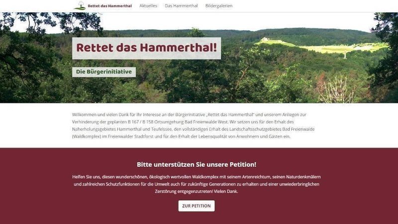 Auf unserer Webseite https://rettet-das-hammerthal.de finden Sie viele Informationen über die Planungen zur B 167 / B 158 Ortsumgehung Bad Freienwalde West und den betroffenen Schutzgebieten sowie alle Neuigkeiten rundum die Bürgerinitiative „Rettet das Hammerthal“.