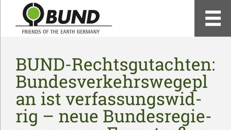 Am 07.10.2021 wurde ein vom Bund für Umwelt und Naturschutz Deutschland (BUND) in Auftrag gegebenes Rechtsgutachten zum Bundesverkehrswegeplan veröffentlicht. Dieses Gutachten zeigt, dass der BVWP verfassungswidrig ist.