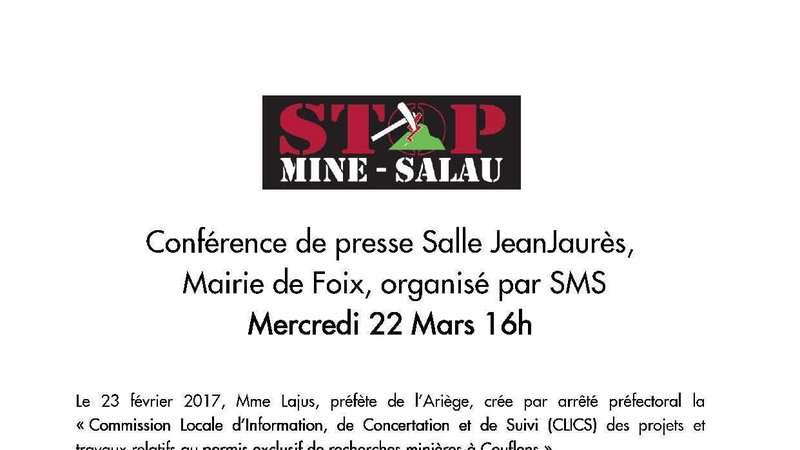 Petition updateNous vous demandons le retrait définitif du permis exclusif de recherche soumis par la société Variscan mines, et de sauver l'avenir de la Commune de Couflens et de la vallée du Haut-Salat.COMMUNIQUE de PRESSE organisée par l'association Stop Mine Salau