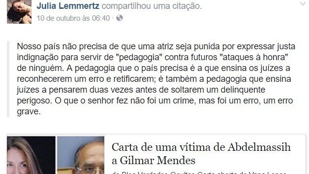 Nosso país não precisa de que uma atriz seja punida por expressar justa indignação para servir de "pedagogia" contra futuros "ataques à honra" de ninguém. A pedagogia que o país precisa é a que ensina os juízes a reconhecerem um erro e retificarem; é também a pedagogia que ensina juízes a pensarem duas vezes antes de soltarem um delinquente perigoso. O que o senhor fez não foi um crime, mas foi um erro, um erro grave.