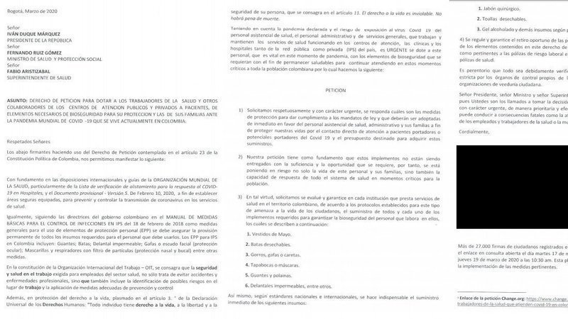 2. Ayer (jueves 19 de marzo del 2020) en la tarde se radicó por medio digital y por medio de correo certificado el derecho de petición a la Presidencia de la República, el Ministerio de Salud y la Superintendencia de Salud. Con los aportes técnicos recibidos, un grupo de médicos y abogados redactó el texto, acompañado de 27000 firmas que se habían registrado a las 36 horas de inicio del proceso.