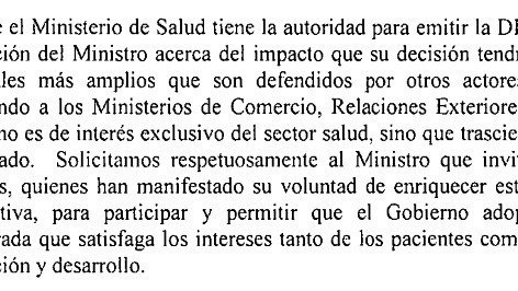 En su comunicación al Ministro de Salud en respuesta a la propuesta inicial de negociación de precio, Novartis sugiere que el Ministerio modifique el proceso previamente establecido para invitar actores que no hacen parte de él, y que han mostrado favorabilidad a negar la declaración de interés público, usando el miedo a las implicaciones/retaliaciones comerciales internacionales contra el país.