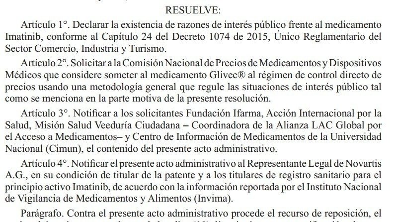 Aunque los medios venían anunciándolo durante toda la semana, hoy se hizo oficial la declaración de interés público de imatinib en Colombia. Acaba de publicarse en el Diario Oficial la resolución 2475 de 2016 en la que se declara la existencia de razones de interés público frente al imatinib http://www.imprenta.gov.co/diariop/diario2.nivel_1