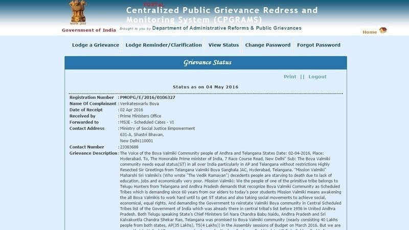 Petition updateMission Valmiki: Reinstate Boyas Scheduled Tribes Status in Telangana and APReply from PMO Grievance Cell regarding Representaion from Boya Valmikis for ST Demand