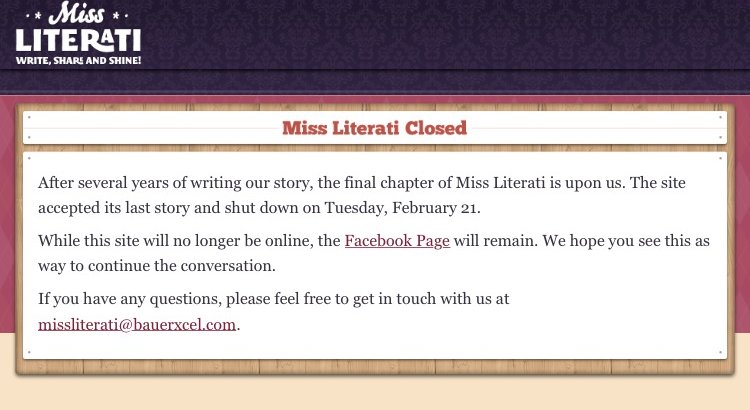 As of Tuesday Febuary 21st, 2017, the website: http://www.missliterati.com was shut down. I personally was un-informed of the closing of the website. I had many years of work saved and published on there. I am no longer able to access them! If you are like me, help reach out the those behind the website, show them that taking away our work isn't fair! Maybe we can't publish anymore, but let me be able to get to the work that I created!! If you feel hurt, mad or upset that this happened to you, make your voice known!!
