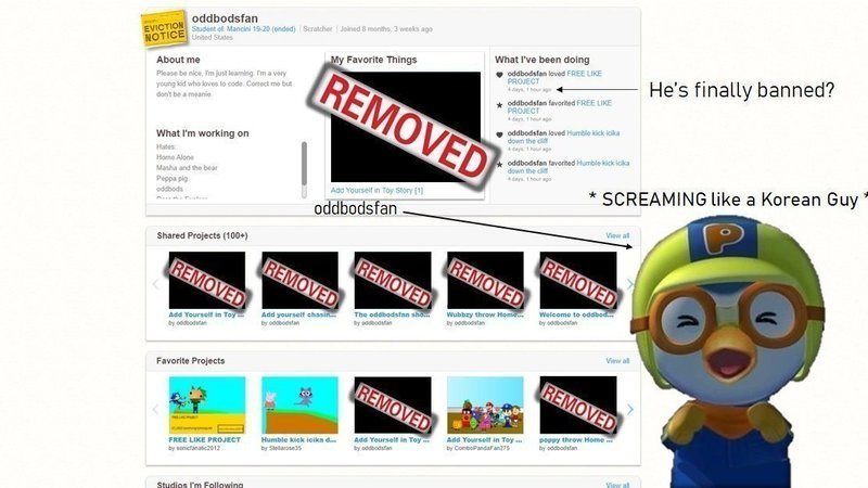 4 days ago, Oddbodsfan is finally got banned from Scratch because of his poor aggressive behavior for remixing so many projects, favoriting & loving other scratchers' projects, forcing scratch team removed my Anti-Fake Vector Piracy Warning project (back in July 14, 2020.), following various scratchers as a stalker, making a poorly written rants & salute, Blocking TSF (TheSpiderFoundation) and deleting ArmstrongJordon accounts (back in October 10, 2020.), Making the hate studios of various cartoon and Home Alone & ripoffs too and making projects out of Macaulay Culkin's character, Kevin McCallister from Home Alone (1 & 2 : Lost in New York).