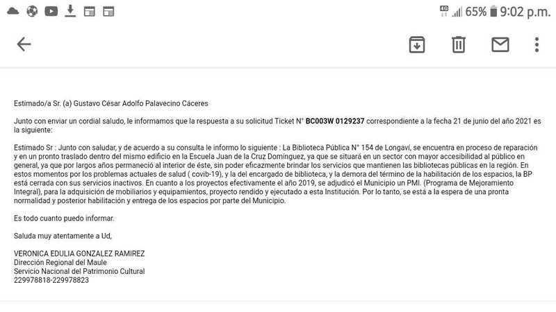 Petition updateNueva biblioteca pública para la comuna de LongavíRespuesta de la Dirección de patrimonio cultural del Maule.