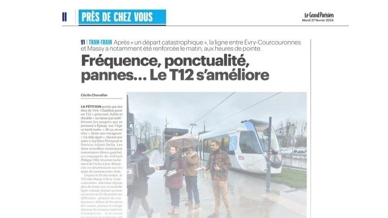 (...) « Cette ligne de tram-train, on y tient, insistent-ils. Elle désenclave certains quartiers et elle facilite le trajet de certains élèves. Mais elle a eu un départ si catastrophique que les gens ont été extrêmement déçus. Il faut absolument que la région présidée par Valérie Pécresse (LR) agisse auprès de l’exploitant pour rétablir l’offre de transport annoncée et améliorer l’information voyageurs. ». C. Chevallier