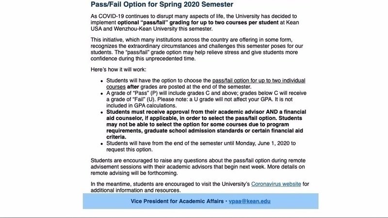 Thank you all for the number of signatures and support! This morning Kean University decided to implement optional "Pass/Fail" grading for up to two courses per student at Kean USA and Wenzhou-Kean University this semester.