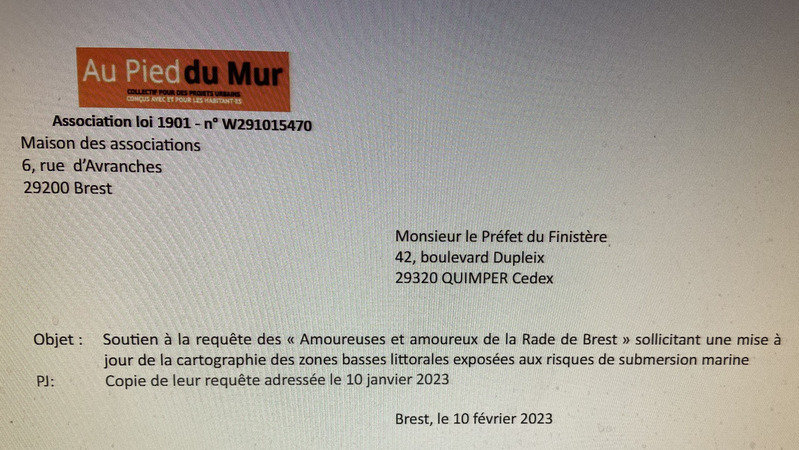 Dans un courrier recommandé daté du 10 février 2023 adressé au Préfet du Finistère, l'Association "Au Pied du Mur" vient d'appuyer la requête des "Amoureuses et Amoureux de la Rade de Brest" à propos des risques de submersion marine à La Cantine du Moulin Blanc. Voici la teneur du courrier :