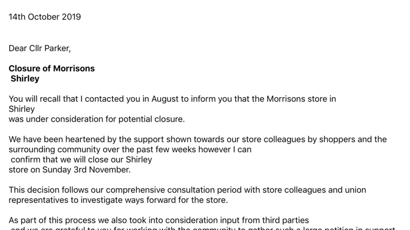 It is with regret that I have been informed this afternoon the decision has been made to close Morrisons in Shirley for good on 3rd November.