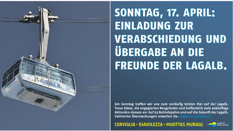 LAGALB- BAHN: WEITERBETRIEB ALS LAGALB AG GEPLANT - JETZT SIND AKTIONÄRE GESUCHT ÜBERGABE AM SONNTAG (17.APRIL) Liebe Lagalbfreunde, Die Nachricht, daß die Lagalb noch gerettet werden soll, hat Euch ja sicherlich schon über die verschiedenen Medien erreicht. Das ist großartig! Zwei Investoren aus dem Engadin wollen die Lagalb- Bahn übernehmen. Dazu soll eine Aktiengesellschaft gegründet werden, für die Aktionäre gesucht werden. Mit bisher 3942 Unterschriften und über 1400 Kommentaren (Stand 14.4.2016) haben wir zusammen ein deutliches Signal gesendet und eindrücklich bewiesen, welches Potential und welche Leidenschaft mit der Lagalb und der Lagalb- Bahn verbunden ist. Nicht nur Feriengäste aus der Schweiz und aus dem Ausland, sondern auch sehr viele Einheimische aus dem Oberengadin wollen die Lagalb- Bahn erhalten. Dafür herzlichen Dank! Dieses unglaubliche Feedback hat auch George Walliser und Rainer Good beeindruckt. Die beiden haben mit großem Elan die Herausforderung angenommen und wollen mit Ihrer Initiative Pro Lagalb die Lagalb AG gründen. Jetzt kann jeder Lagalb- Fan seinen eigenen Anteil an der Lagalb- Bahn erwerben und Aktien bestellen. Mehr Informationen dazu gibt es hier auf der Website von Pontresina: http://www.pontresina.ch/winter/events-news/news/news/news/Initiative_Pro_Lagalb_gruendet_die_Lagalb_AG.html?tx_ttnews[backPid]=194 Ein sehr großer Dank auch an die Gemeinde Pontresina und die Engadin St.Moritz Mountains AG, die Ihre Unterstützung und Kooperation angekündigt haben. Am kommenden Sonntag wird an der Lagalb aber erstmal gefeiert! Kommt alle, um die Zukunft der Lagalb zu beginnen! Bis Sonntag! Herzliche Grüße Florian Wurfbaum in Namen der Lagalbfreunde www.facebook.com/Lagalbfreunde lagalbfreunde@gmx.de