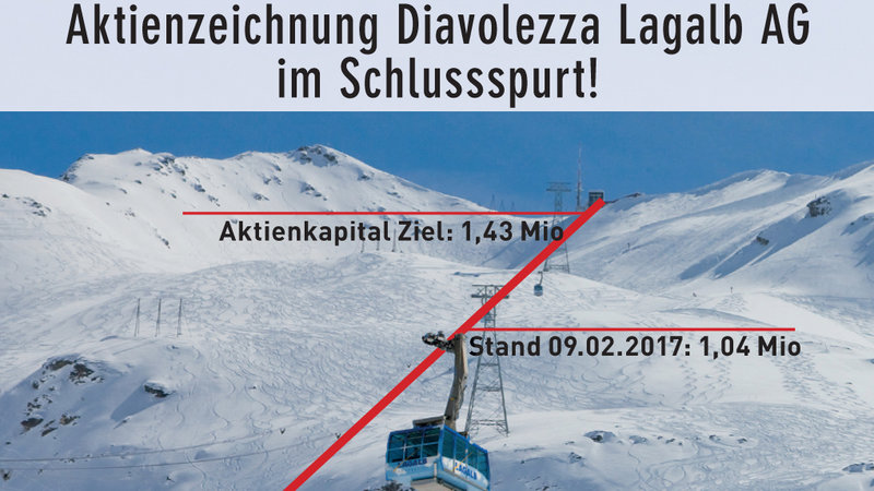 Neuigkeit zur PetitionLagalb- Bahn als wichtigen Bestandteil des Engadiner Tourismus Portfolios erhaltenUPDATE KAPITALERHÖHUNG DIAVOLEZZA LAGALB AG: SCHON ÜBER 1,04 MIO! ZEICHNUNGSFRIST- ENDE AM 28.2.'17