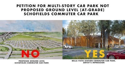 We seek a reversion to the originally promised multi-story commuter car park, we request that the new car park be located in a more appropriate location for commuters and surrounding residents alike. This petition seeks a solution that is suitable for all stakeholders and enriches the wellbeing of the residents of Schofields.