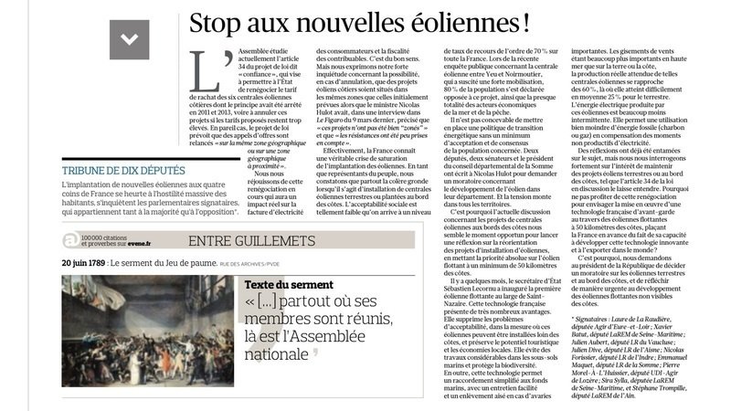 20 июн. 2018 г. — http://premium.lefigaro.fr/vox/societe/2018/06/19/31003-20180619ARTFIG00340-stop-aux-nouvelles-eoliennes-le-cri-d-alarme-de-dix-deputes.php