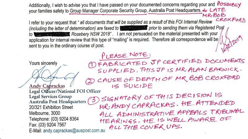 The letter attached here is with my comments. The three lawyers of Australia Post that I am aware of that know this matter and failed to act in a proper way are Mr Andy Caprackas, Mr Steve Brother son and Mr Oliver Cousland.