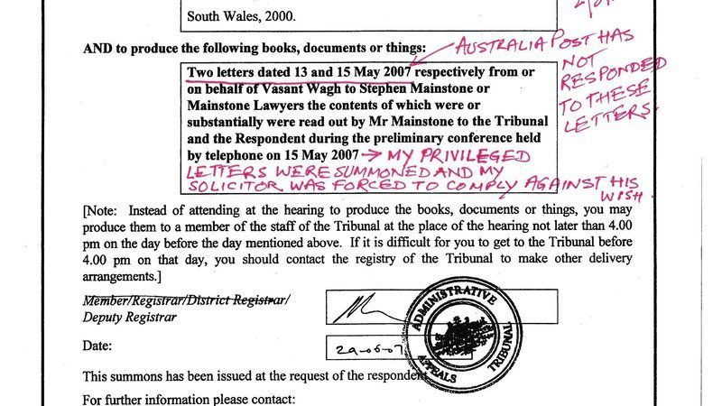 Today I am posting a document to show my current and future supporters about how the Administrative Appeals Tribunal-AAT helped Australia Post by approving the summons applied for by a Corporate Lawyer of Australia Post Mr. S.J. Brotherson. “S” stands for Steve. Mr Brotherson was attending the AAT hearings but was not representing Australia Post. He used to take a back seat and make notes. Mr. Mick Batskos of the business called FOI Solutions based in Melbourne, where Australia Post’s headquarters is located, was hired by Australia Post. He was receiving instructions from Mr Andy Caprackas who was sitting next to Mr Batskos at the hearings in AAT. Mr Caprackas was the Legal Officer and National FOI Officer of Australia Post.
