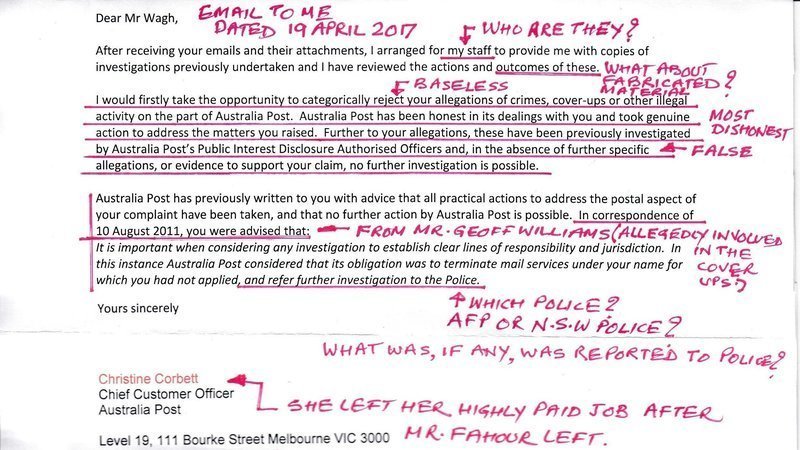 2. Documentary evidence of unacceptable conduct of many past and present Australia Post officials is available. Mr Corbett wanted to dismiss that completely. She was never going to be successful in justifying her baseless denials of cover ups like this one.