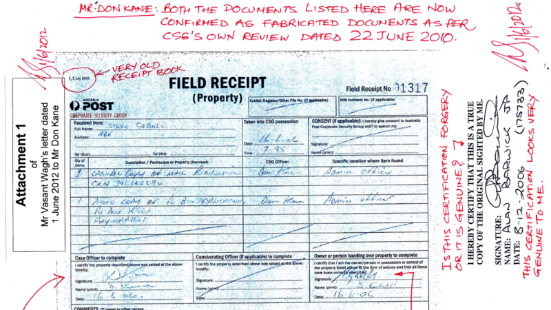 The two signatories on this Field Receipt are Mr Steve Gabell and Mr Don Kane. Mr Gabell was the one who identified the irregular activities, had conversations with us, had meeting with us and he worked at the Delivery Facility of Australia Post in Sydney. Mr. Kane was the investigator and he signed for only the two documents as appearing on the Field Receipt.