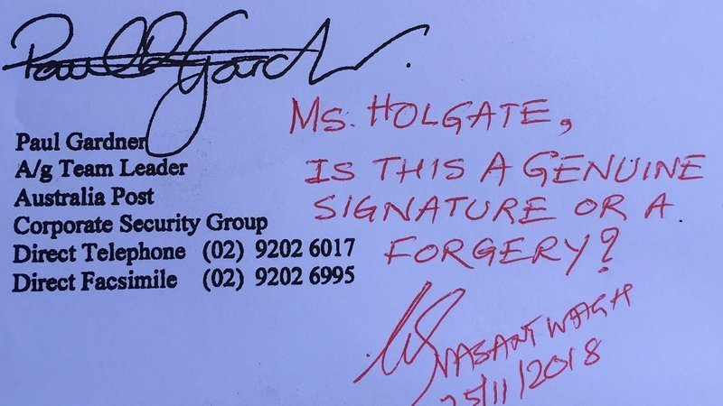 As I requested you before I need a letter from you on Australia Post letterhead complete with your address, contact phone and fax number with your usual full signature (NOT JUST INITIALS) with the response indicating if the signature here is your signature or is a forgery. It is that simple.
