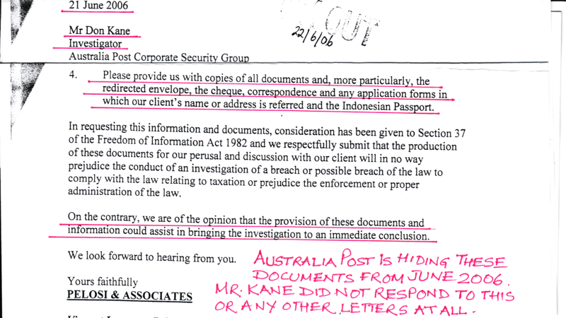 My this update will show you how Australia Post is hiding the truth, documents and protecting the wrongdoers in Australia Post from June 2006. Please look at the part of my solicitor at the time, Mr Pelosi’s letter to Mr Don Kane. He was the investigator in my Identity Theft matters and the first person from Australia Post Corporate Security Group NSW-CSG NSW to accept the REAL documents and information from Mr Steve Gabell of Australia Post’s Alexandria Delivery Facility at the time. This hand over happened on 16 June 2006. What followed was the cover ups after cover ups. This involves his boss at the time Mr Alan Barwick JP who was the State Manager of Australia Post CSG NSW at the time. Mr Barwick is also involved in certifying fabricated and other documents in this matter in his capacity of Justice of the Peace. He did it without disclosing his conflict of interest in this matter by breaching the rules applicable to JP’s while certifying documents.