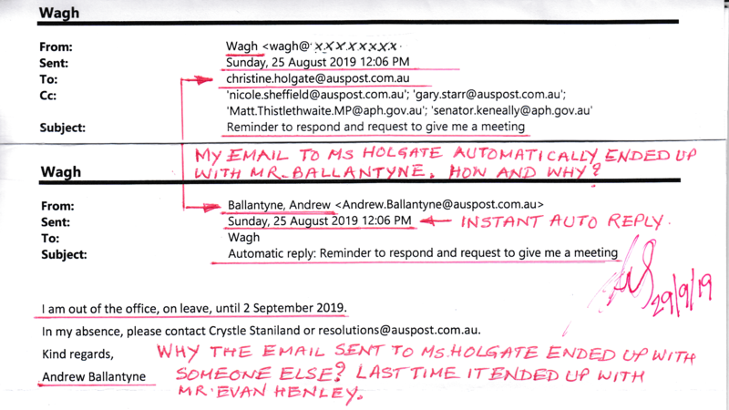 This update is the further confirmation that my emails sent to Ms Christine Holgate who is the MD and Group CEO of Australia Post are automatically ending up with other people. I have not seen any public notice from anyone at Australia Post including Ms Holgate that the emails sent to Ms Holgate on her official email address-christine.holgate@auspost.com.au could end up automatically with others on a different email address.