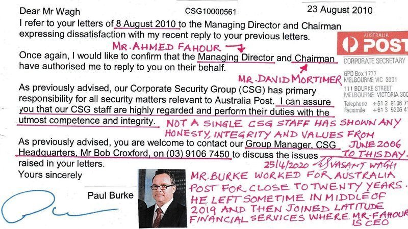 Ms Holgate has failed to respond to any of my letters, faxes, emails and phone calls so far. My efforts to get justice for my family will continue. Today I am sharing my letter I sent to Mr Paul Burke who was the Corporate Secretary of Australia Post at the time. He did not respond to my simple question about who has the oversight for Australia Post Corporate Security Group (CSG) officials. After giving him about a month to respond I had no choice left than to wright to Mr Ahmed Fahour-former MD & Group CEO of Australia Post that Mr Burke is not responding. Mr Fahour also did not respond.