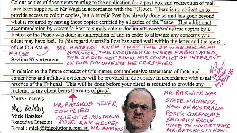 Australia Post must have spent lot of money to pay Mr. Batskos and also to fly him from Melbourne to Sydney several times along with Mr Caprackas for AAT hearings. This was obviously for protecting their own corruption where fabricated documents were released to me under the FOI Act for hiding the truth, the real story and the real documents. My fight for justice is not going to stop. This business, FOI Solutions, must be investigated more than ever before for its lack of honesty, integrity and values in my matters.