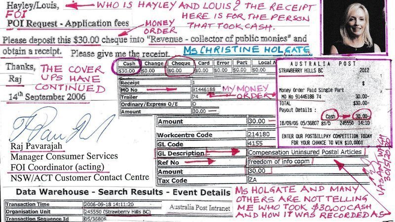 Today I am posting a compelling documentary evidence in addition to what was supplied earlier with my previous updates. As Australia Post officials were not coming clean, failing to tell me the truth and failed to provide me with the copies of the actual REAL documents involved in my ID Theft matters I applied for those under the Freedom of Information Act. This was my first such application that was sent to the Corporate Lawyers office as per the procedures at the time. A Money Order for $30.00 was included with my application as required to process the FOI application.