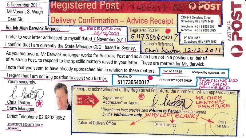 In my last update I mentioned the name of the successor of Mr Alan Barwick JP. He is Mr Chris Lenton. Mr Barwick certified fabricated Australia Post documents while holding the position of the State Manager of Australia Post Corporate Security Group NSW/ACT. This was obviously to cheat me in believing that those were the documents involved in the fraud and crimes. That effort failed because what we were told and what was on the documents did not add up at all. The dates were all over the place. There were many other issues with these documents.
