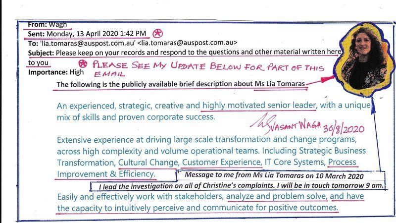 Please read my following two emails. The first one is addressed to Ms Lia Tomaras and the next one is addressed to Ms Christine Holgate. No one responded. The copy of my email to Ms Holgate was provided to Ms Tomaras.