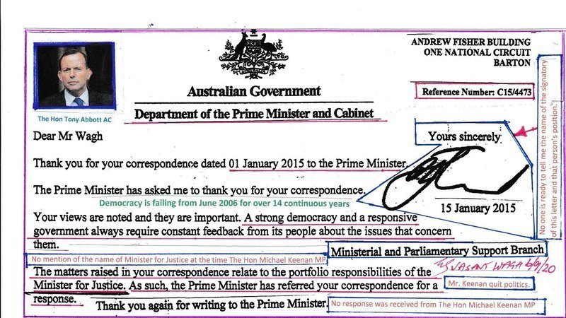 The following letter that Mr Abbott failed to respond to has raised serious questions about his ability to protect the democracy in our country is my view. The trust in many politicians has evaporated but many ordinary people may not get the first hand experience about their untrustworthiness unless they experience uncontrolled cover ups. Numerous people have allegedly joined hands to cover up corruption, crimes, wrongdoings, fabrication, unethical activities, cheating, lying and are failing to do the jobs for which they get paid for. This is also the case about those that have left their jobs and positions after contributing to keep the truth covered up.