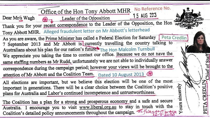 This letter was in response to my letter dated 10 August 2013 to the Hon Tony Abbott MP when he was the Leader of the Opposition. My letter was faxed to Mr Abbott’s Principal office on (02)99778715 on the same day which was 10 August 2013.