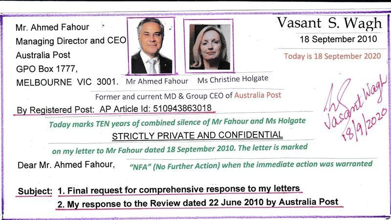 Please help as this unacceptable silence of the successive MD’s and Group CEO’s of Australia Post that earned and are earning millions of dollars for their services to do the job with honesty, integrity and values have failed to act on this matter to its conclusion from June 2006. This is unjust, unfair and unreasonable by any standards.