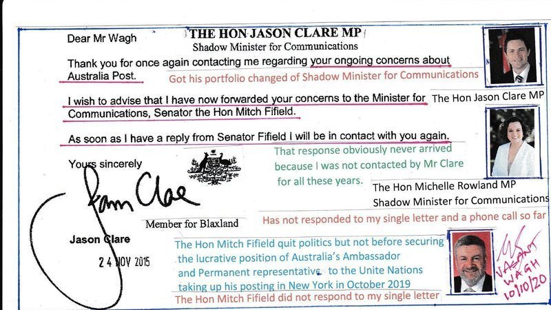 Today I am providing a documentary evidence of a letter to me from the former Shadow Minister for Communications the Hon Jason Clare MP. Unacceptable conduct of Australia Post officials is very well known to Mr Clare for a very long time. This was from the time Mr Clare was Minister for Justice and Minister for Home Affairs while Labor was in the government. Extensive communication is on the records.