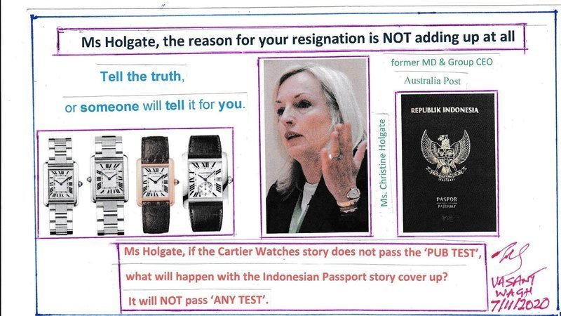 In my view this is a 100% false story. 100% baseless story. 100% easy escape route provided to Ms Holgate to run away from Australia Post job. 100% untrustworthy story made up by the media. 100% indirect support to Ms Holgate by many big names in our country that already know about my fight for justice from many years already. 100% deliberate derailing of the truth behind this resignation to protect Ms Holgate’s reputation. 100% deviation from the independence and impartiality that is expected from the media. 100% exaggeration and disproportionately blowing out the story of $20,000 spent by Ms Holgate to give away expensive Cartier watches as gifts some two years ago.