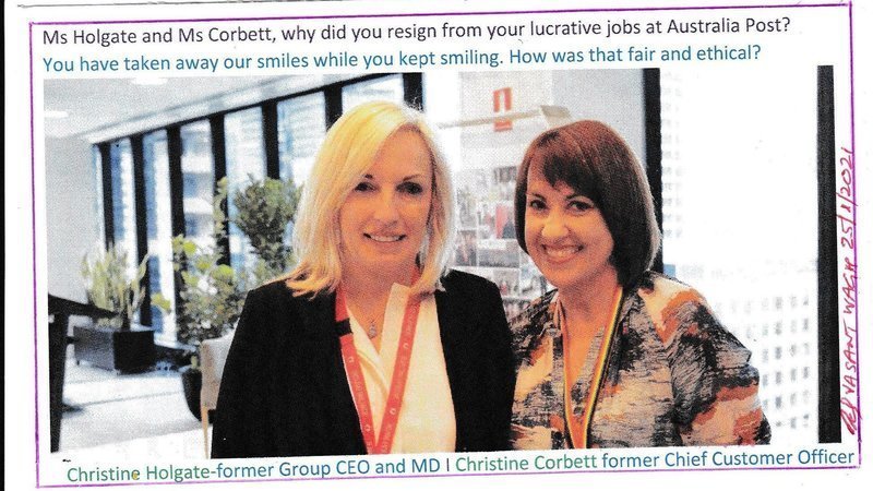Ms Christine Corbett was the Chief Customer Officer. She was also Acting Group CEO and Managing Director between the period Ms Holgate took office and Mr Ahmed Fahour-former MD & Group CEO left. She was made Acting Executive General Manager-Consumer and Community while her replacement was found and after her decision to leave Australia Post.