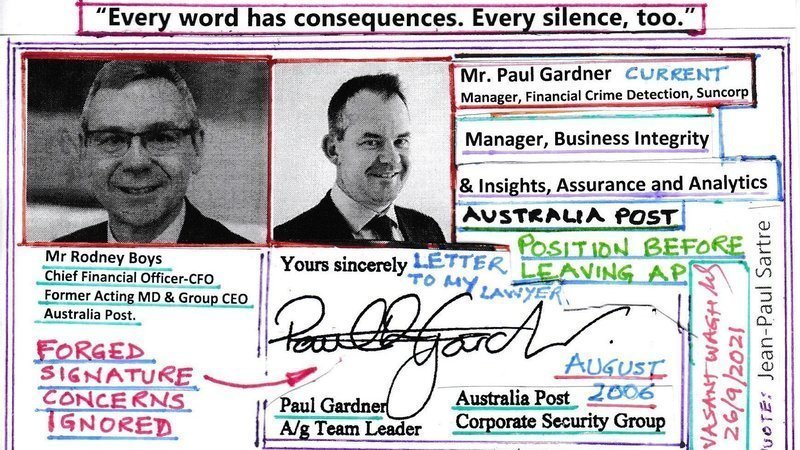 The above is the information about the same Mr Paul Gardner that worked for Australia Post. You did not inform me that he is no longer working for Australia Post. I have enquired with you and many others about his suspected forged signature on the letter to my solicitor. You did not respond.