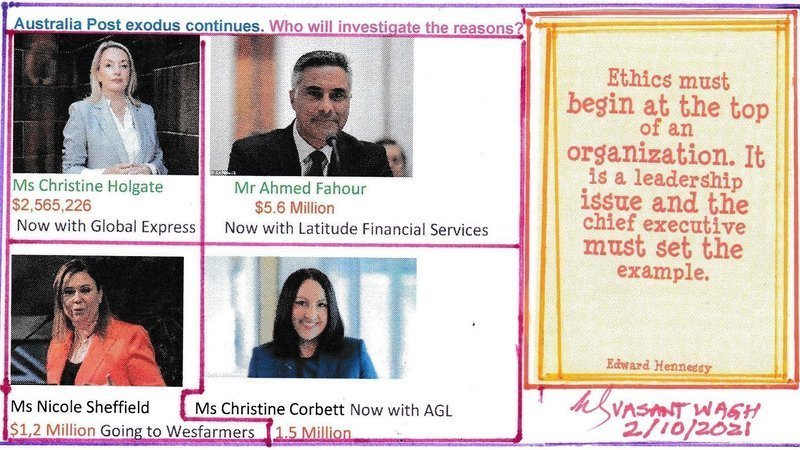 Your predecessor had no courage to continue in Australia Post and then with PwC as well. With PwC job, she had a massive conflict of interest as they are appointed to take information from the Whistle-blowers. She did not respond to my single letter sent to her when working for PwC. You know her very well. She was a 1.5-million-dollar remuneration employee of Australia Post- Ms Christine Corbett. She was promoted from four levels down by Mr Fahour was in the news. Mr Fahour also had no courage to resolve this matter. Mr Bob Croxford’s death, where the cause is suicide, happened under Mr Fahour’s leadership. Mr Croxford was my contact person just 19 days prior to his death. Then Mr Fahour and his loyal team covered up that death from me. They have many questions to answer. Two of them have made a run from Australia Post. They are Mr Paul Burke and Ms Erin Kelly. You know where they have gone after leaving Australia Post’s long-term jobs. Baseless positions were created for them. For Ms Kelly it was Corporate Secretary Office of the Managing Director and for Mr Burke General Manager Office of the Managing Director. These were the two brick walls that were erected by Mr Fahour for his own protection. These positions were later abolished. Now we have General Counsel & Corporate Secretary. A position unheard of earlier. This is for the protection of Ms Holgate. Now Mr Nick Macdonald, holding this position, is not responding to my letters. Did he tell you not to respond to my letters or it is your own initiative?