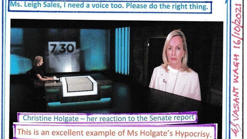 Ms Leigh Sales has not shown any impartiality while giving voice to Ms Holgate and not to me. The soft corner of media towards Ms Holgate is not justified especially when they are made aware of the alleged gross misconduct of Ms Holgate and Mr Fahour on an ongoing basis.