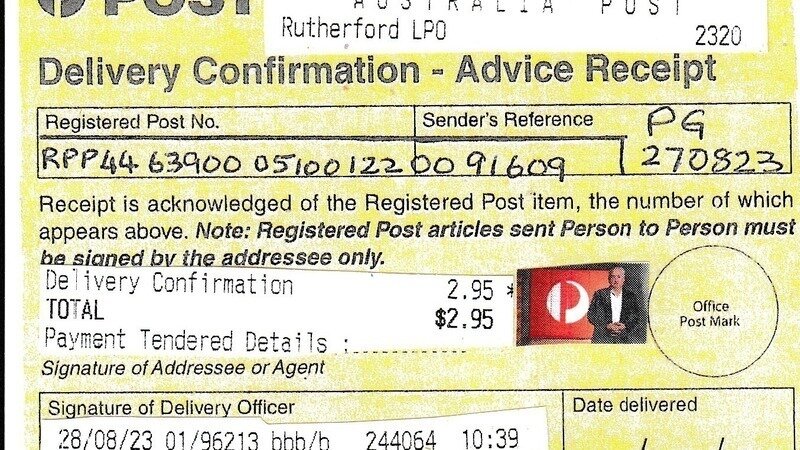 This letter was sent to Australia Post Head Quarters in a mail bag as a Bulk Delivery is my understanding. The usual procedure of detaching this card from the registered Post letter, signing this card by the Post official, handing it over after placing a Post Stamp and then the recipient signing this card at the Melbourne Post office allegedly did not take place as it was simply put in the big mail bag heading to Australia Post HQ.