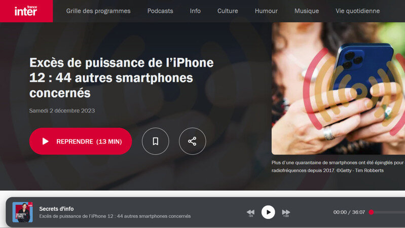 Cher(e) soutien, la Cellule investigation de Radio France a consacré hier un reportage audio de 20 minutes au scandale du Phonegate, intitulé : « Derrière l’iPhone 12, d’autres smartphones trop puissants ». Cela a été l’occasion pour le Dr Arazi, de rappeler que les « mises à jour » de DAS autorisées par l’ANFR sont « une double peine » pour des millions d’utilisateurs de smartphones. En effet, après avoir été surexposés, la performance de connectivité de leur portable baisse. Pourquoi et comment la France autorise un tel cadeau fait aux fabricants ? Une question qui aurait mérité d’être posée...Merci de relayer largement, l'équipe Alerte Phonegate (Faire un don déductible) (signez la pétition iPhone 12)