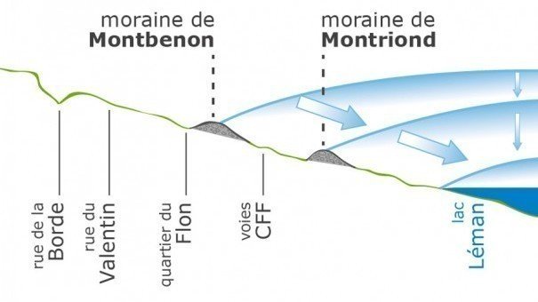 La première illustration nous montre les différentes époques glacières et les deux moraines laissées dont celle de Montbenon où pousse la forêt du Flon, et celle de Montriond.