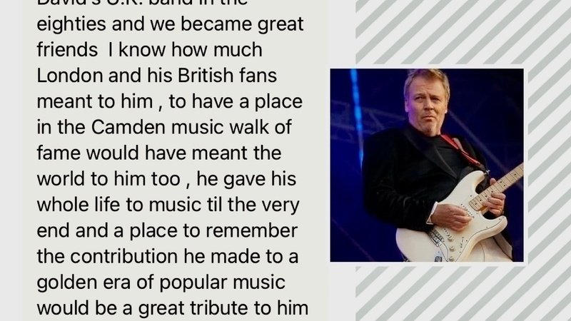 I was lucky enough to play in David’s U.K. band in the eighties and we became great friends I know how much London and his British fans meant to him , to have a place in the Camden music walk of fame would have meant the world to him too , he gave his whole life to music til the very end and a place to remember the contribution he made to a golden era of popular music would be a great tribute to him and his fans here in the U.K.