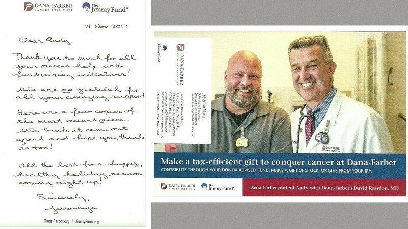 Meanwhile Andy continues to do what he can to raise awareness and money for other people in need. Here's a letter of appreciation he received from the Dana-Farber Cancer Institute & The Jimmy Fund. Thanks again to all of you~our wonderful support system!