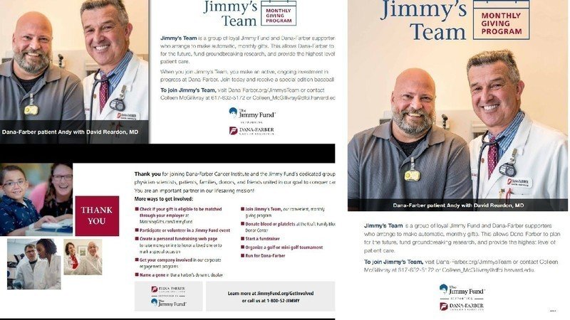 We have two new projects that we would like to use your photo with. They are both attached. One is an insert we will include in our acknowledgment letters to donors. The other is a digital ad that will be on display at the Institute. Both are intended to encourage people to sign up for our Jimmy's Team donor group.